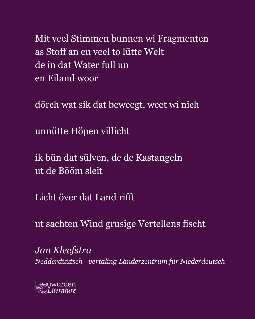 Speciaal voor Internationale Moedertaaldag hebben Cities of Literature Bremen en Leeuwarden elkaars gedichten in elkaars talen vertaald. Het Länderzentrum für Niederdeutsch verzorgde een vertaling in het Nederduits van het gedicht van Jan Kleefstra, terwijl Ytsje Steen een Friese vertaling maakte van het gedicht dat Christine Glenewinkel uit Bremen bijdroeg aan de digitale tentoonstelling. In Selenslötel schrijft zij over de diepere betekenis van taal en wat het betekent om in een andere taal te schrijven – hier een passage uit de Friese vertaling: