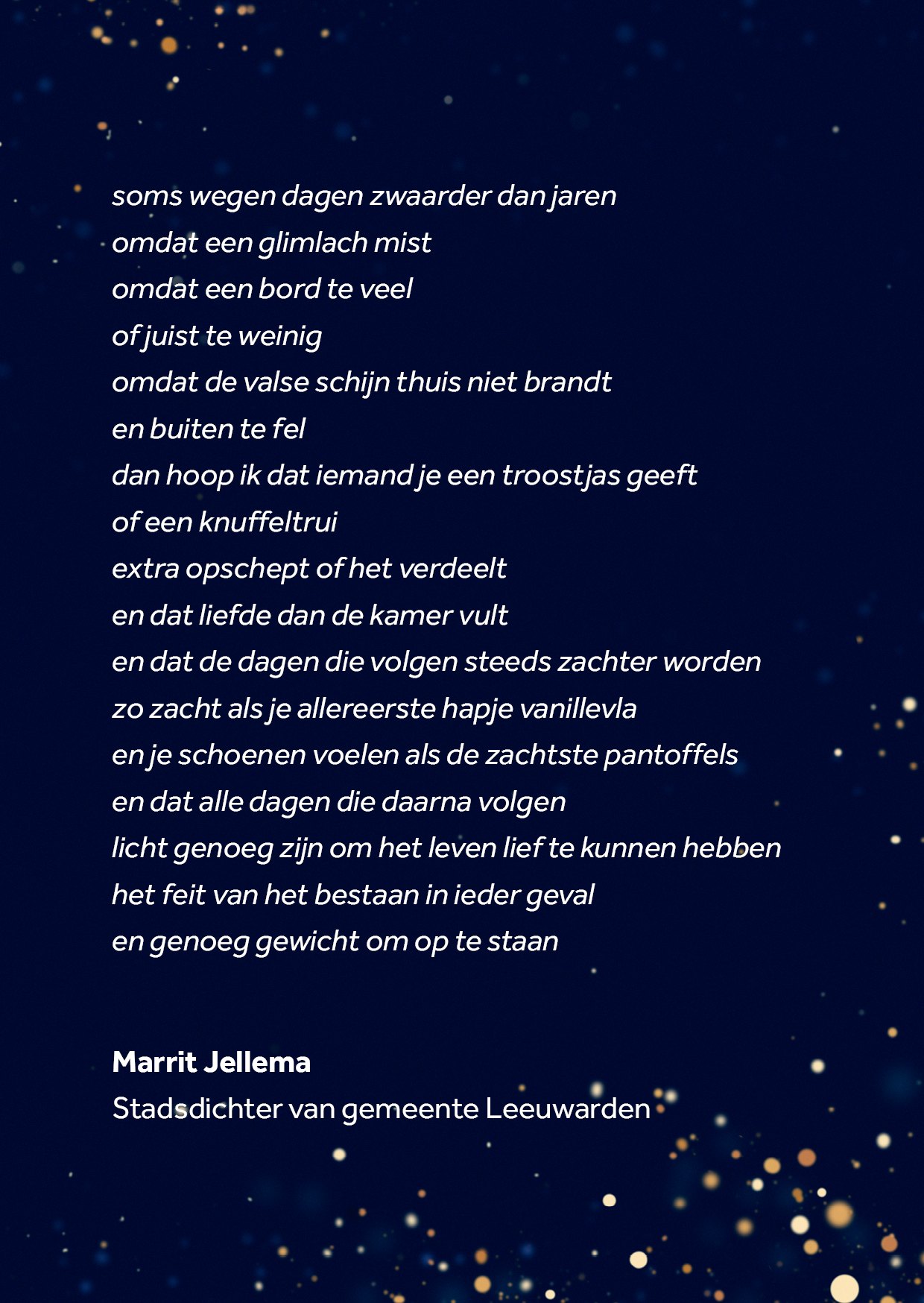 Een regel uit het eindejaarsgedicht van Marrit Jellema, stadsdichter van de gemeente Leeuwarden. Ze schreef het gedicht voor wie fijne dagen niet vanzelfsprekend zijn.